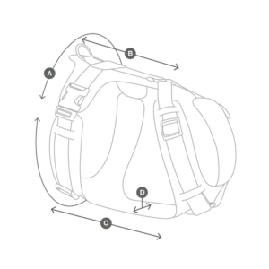 L: Chest 70-86 cm (A), Back strap 23 cm (B), Belly strap 33 cm (C), Wide chest and side straps 5 cm (D)